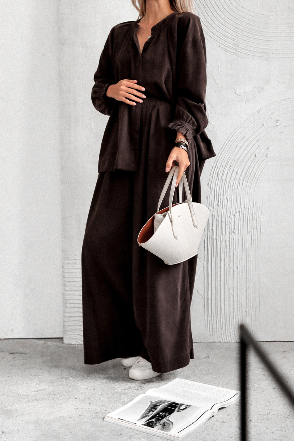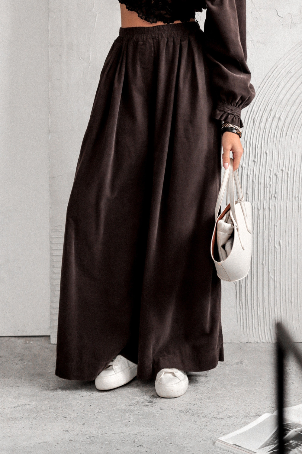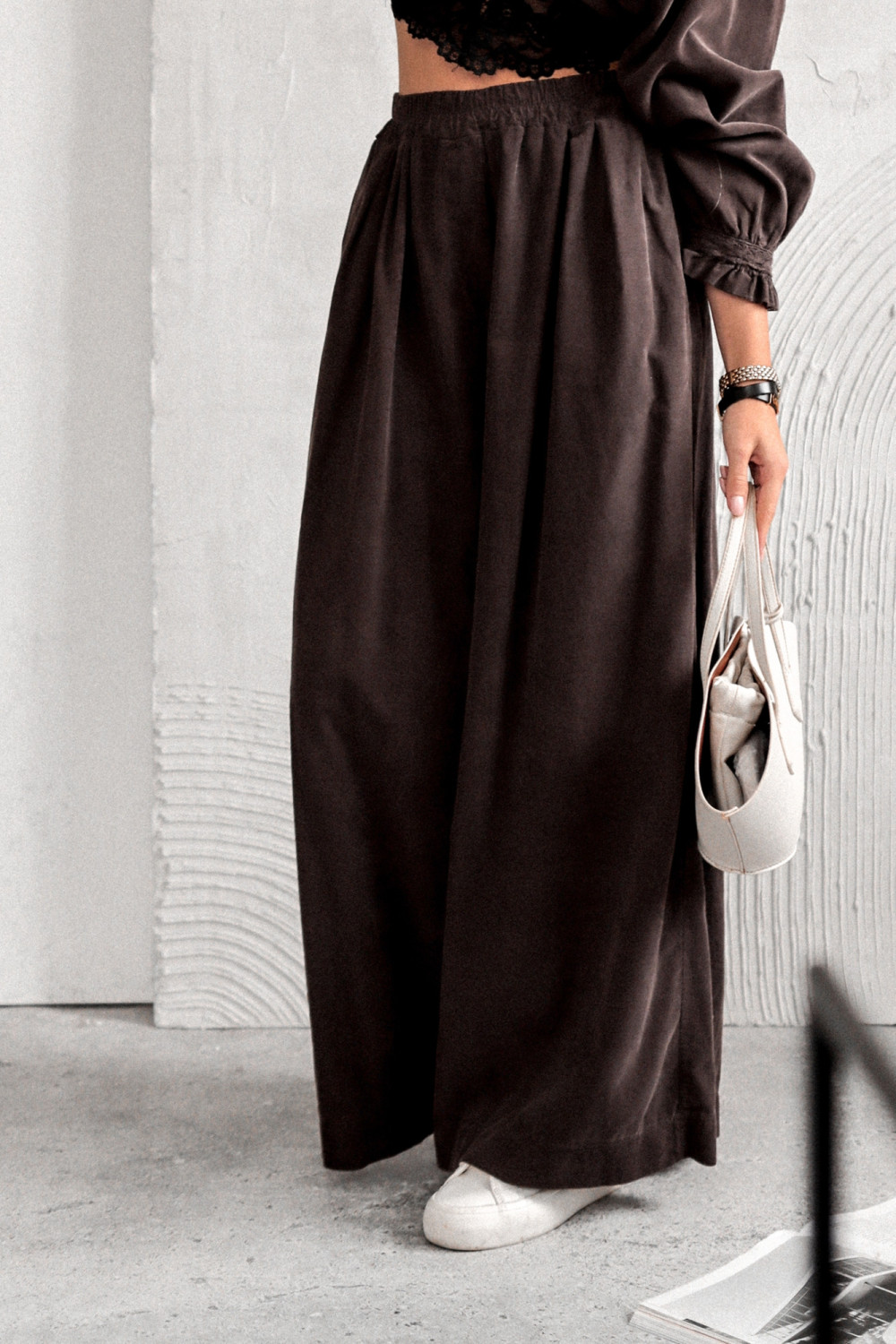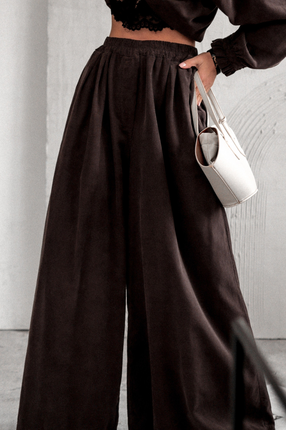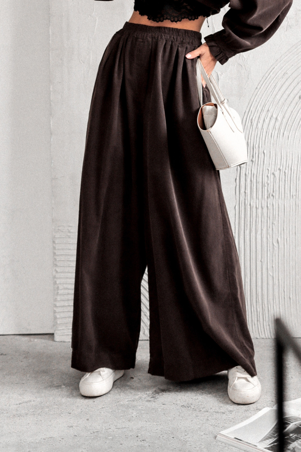 Luźniejszy krój z poszerzaną nogawką pięknie układa się na sylwetce, a zakładki z przodu subtelnie podkreślają talię, nadając całości eleganckiego charakteru. Elastyczna gumka w pasie sprawia, że spodnie doskonale dopasowują się do każdej figury, nie tracąc przy tym stylowego wyglądu. Dwie funkcjonalne kieszenie z przodu dodają praktycznego akcentu.