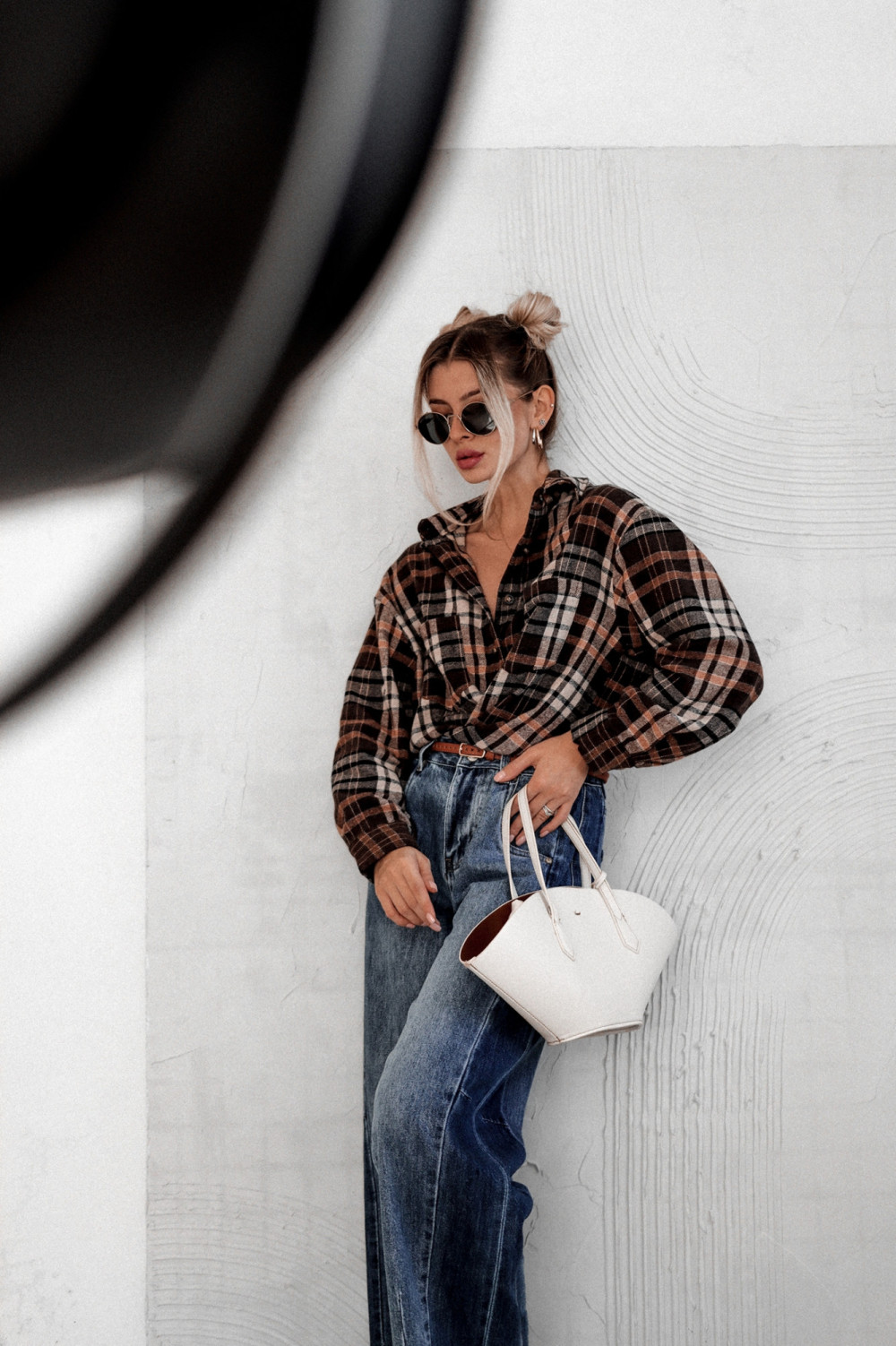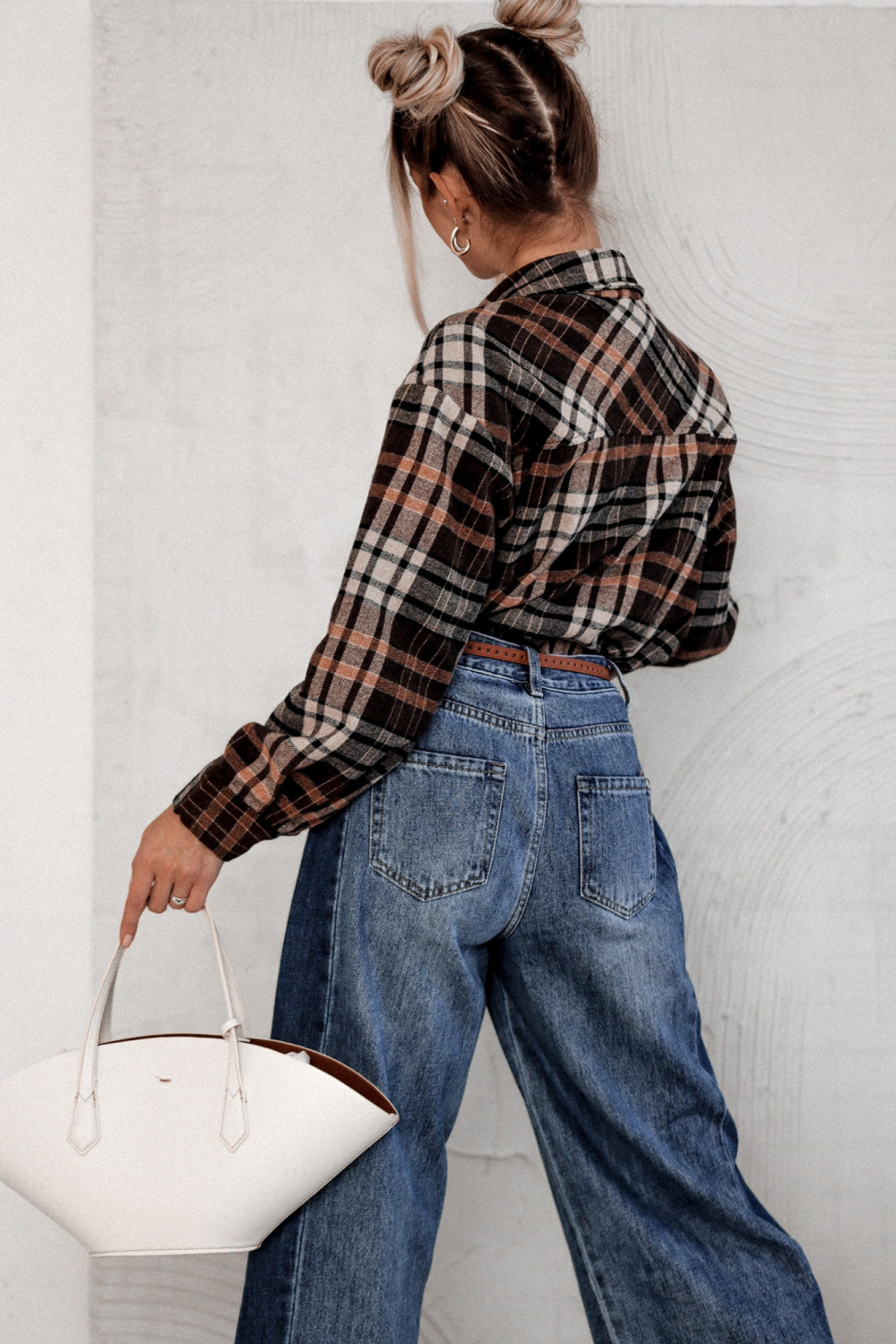 Model wyposażony w klasyczny kołnierz, zapięcie regulowane na guziki oraz długi rękaw zakończony mankietem, łączy wygodę z elegancją. Drobna kieszonka z przodu dodaje praktycznego i casualowego charakteru. Wzór w kratkę w odcieniach czekoladowego brązu to ukłon w stronę jesiennych trendów – ciepły, głęboki kolor uznany za jeden z najmodniejszych tej jesieni.