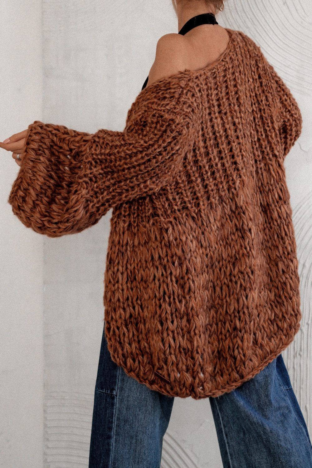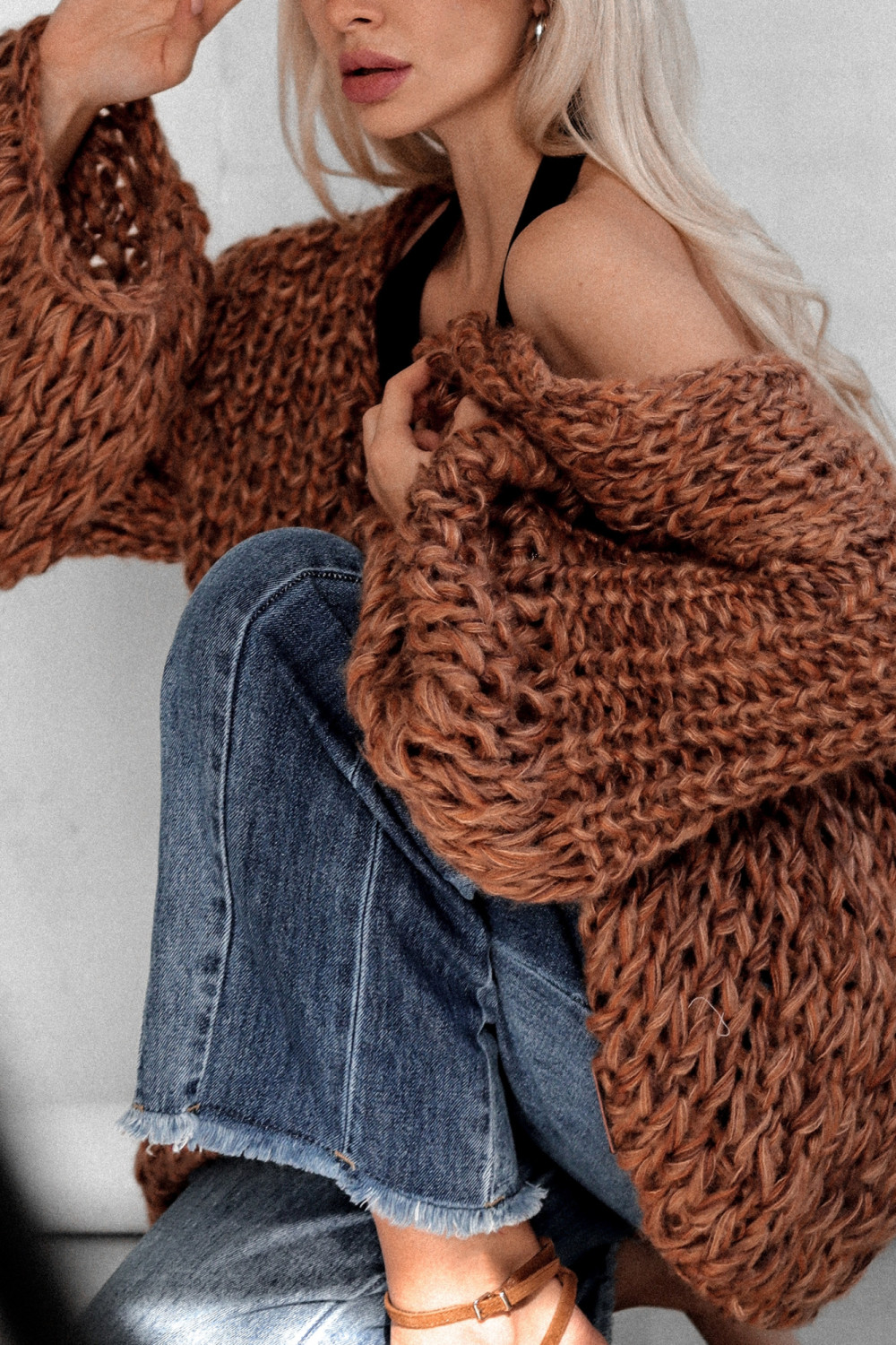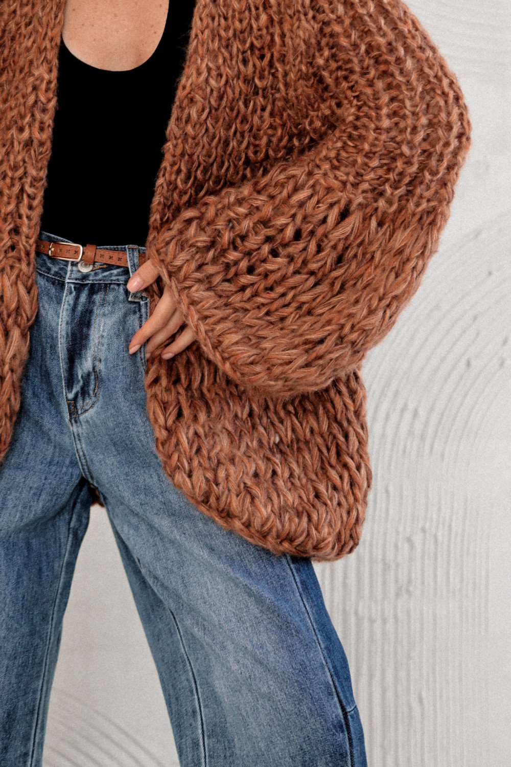 Otul się stylem i komfortem z naszym wyjątkowym kardiganem o luźniejszym kroju, wykonanym z grubszej, ręcznie dzierganej włóczki. To must-have sezonu AW25, który łączy modę z rzemiosłem – każdy egzemplarz to unikat!