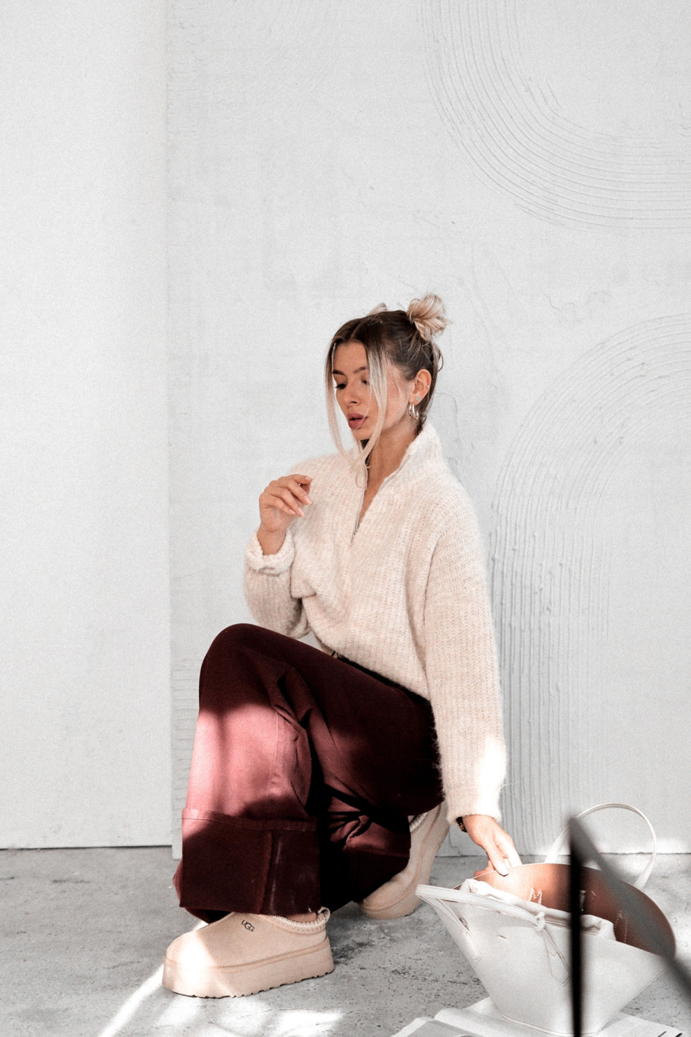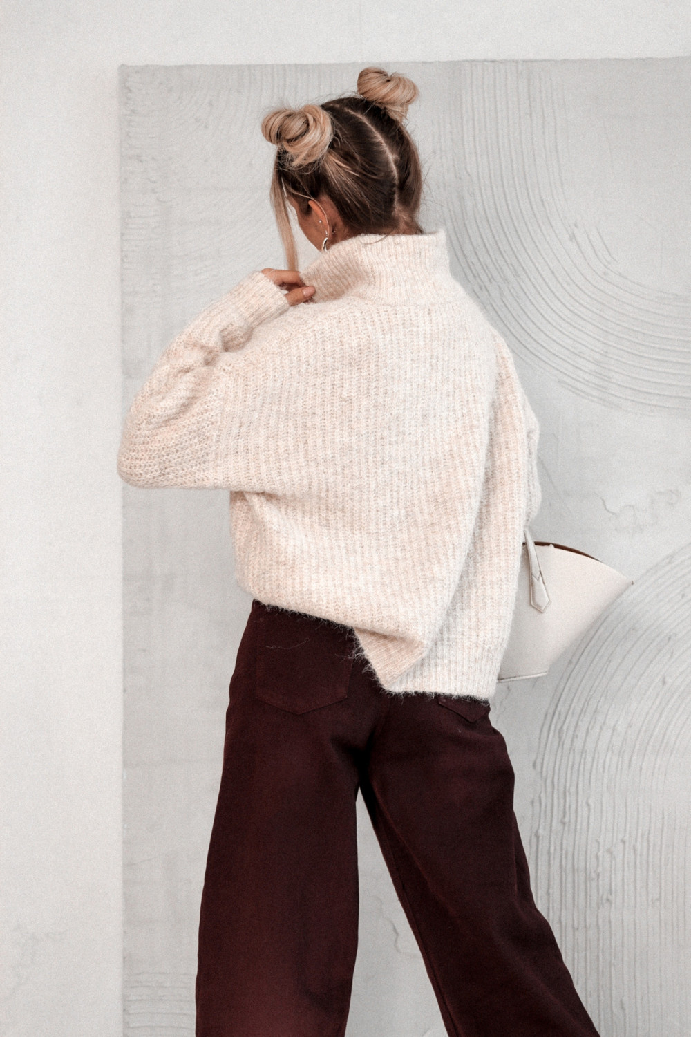 Model wyposażony w praktyczny kołnierz na stójce z zamkiem, który pozwala regulować dekolt i stylizację w zależności od okazji. Długi rękaw i minimalistyczny fason sprawiają, że sweter świetnie sprawdza się zarówno w eleganckich, jak i casualowych zestawach.