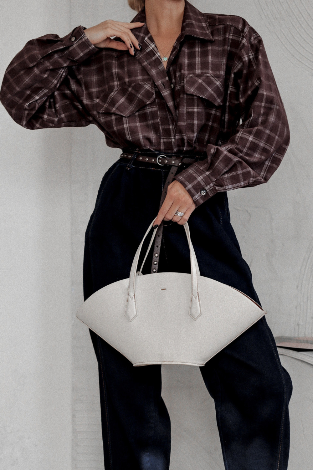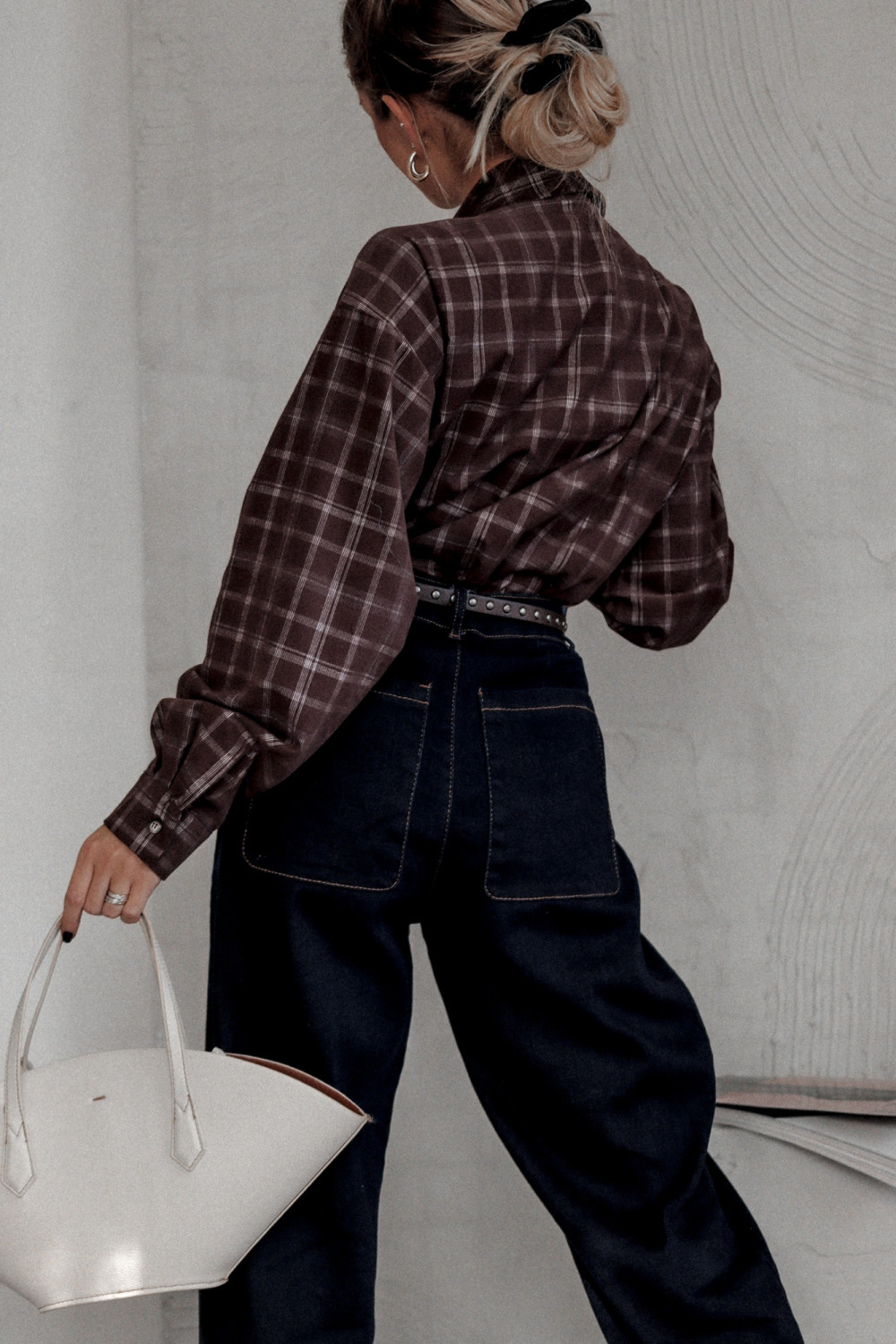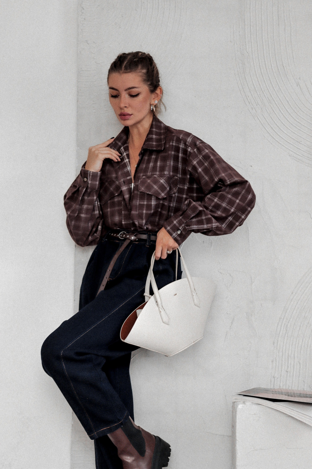 Całość dopełnia ponadczasowy wzór w kratkę w odcieniach czekoladowego brązu i beżu – idealna paleta kolorystyczna na sezon przejściowy i zimowy. To niezastąpiony element garderoby, który świetnie odnajdzie się zarówno w stylizacjach biurowych, jak i weekendowych.