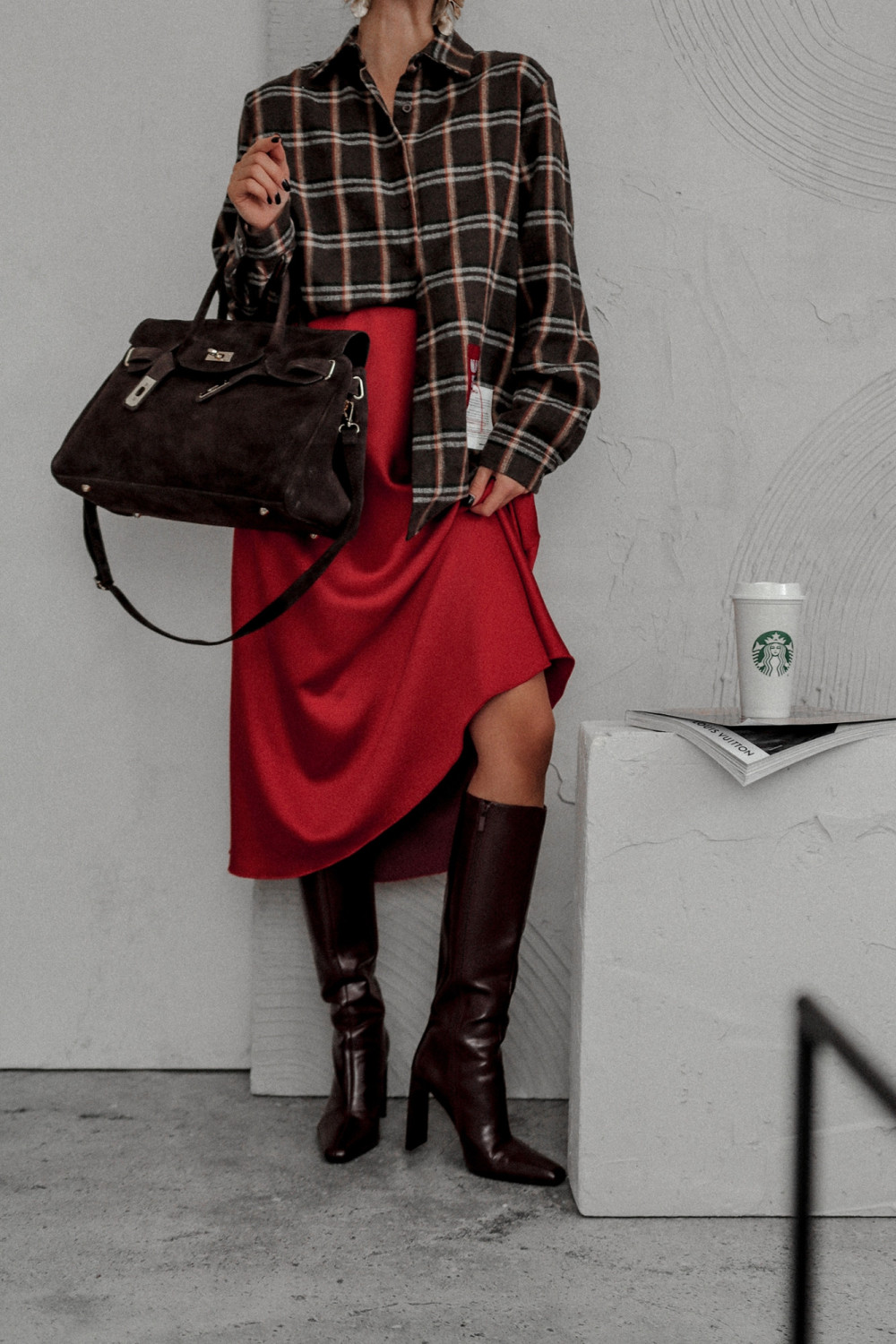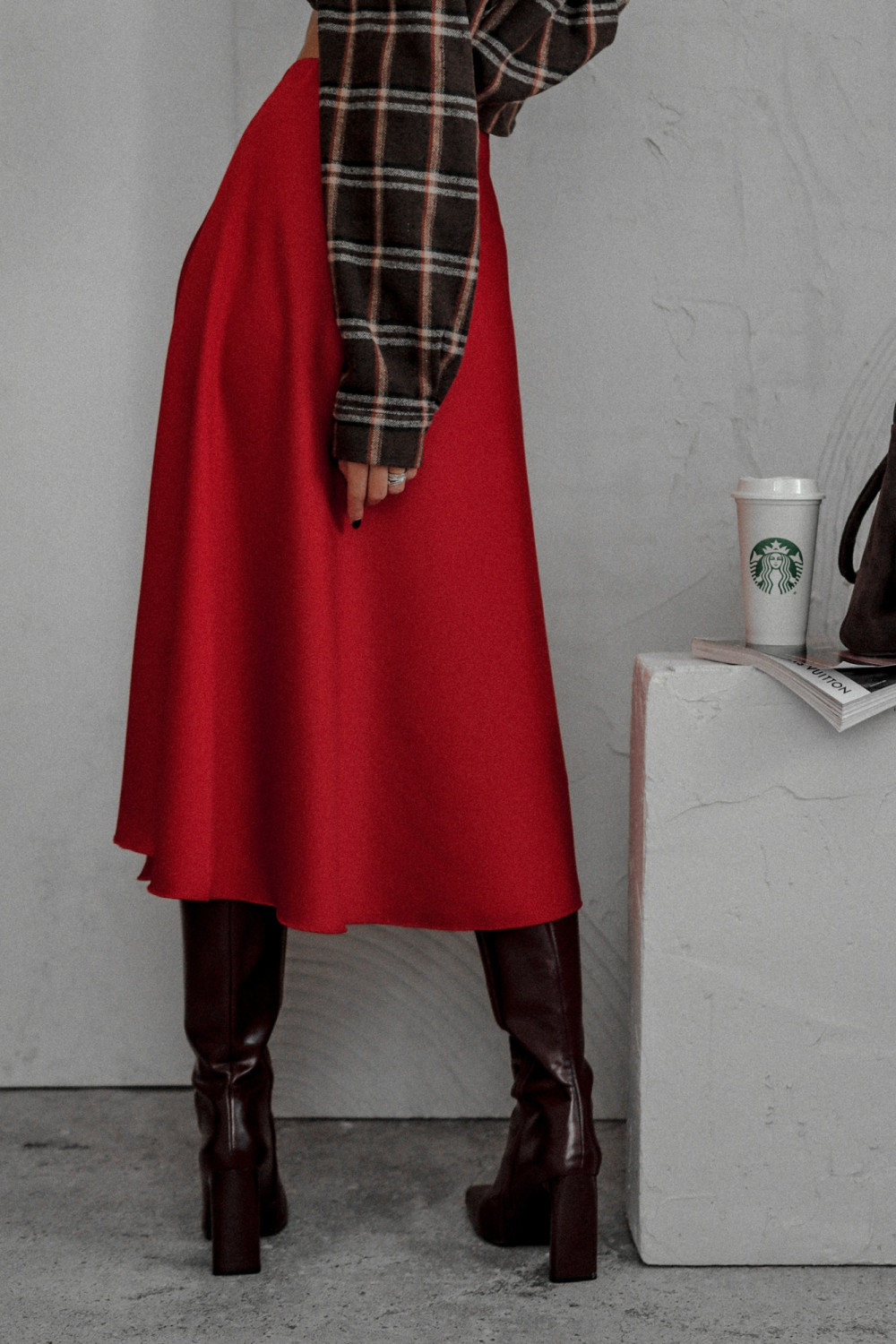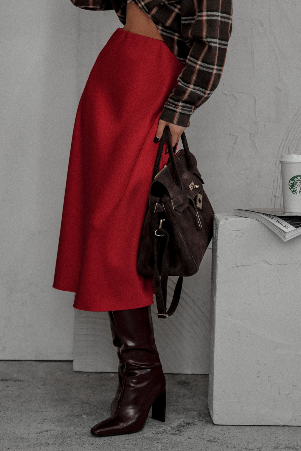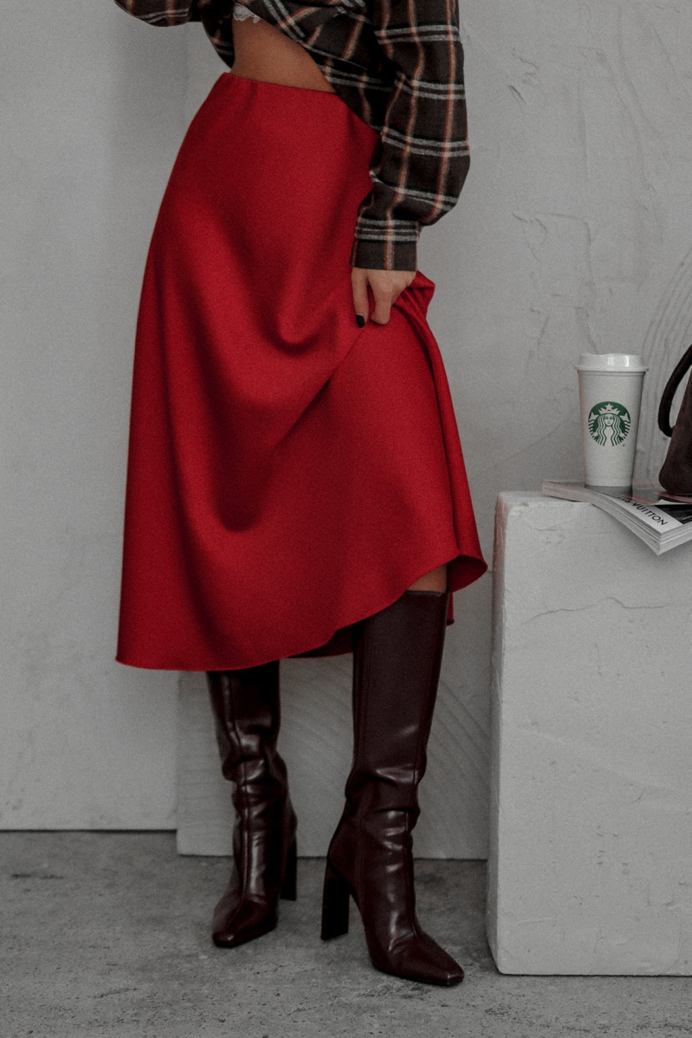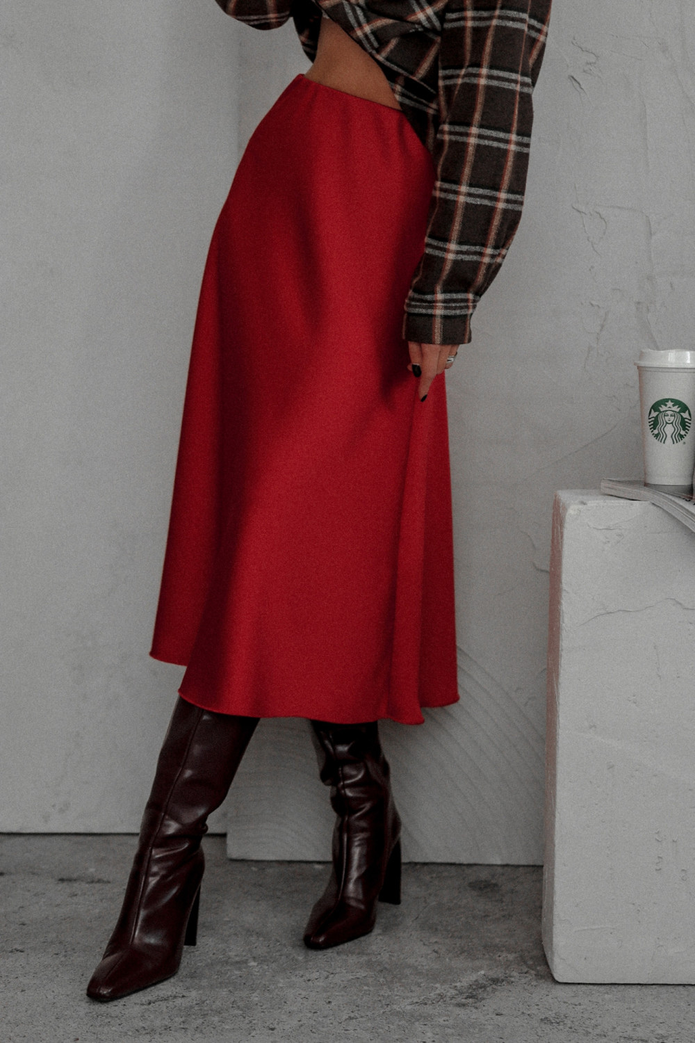 SPÓDNICA MIDI MYSTIC NIGHT O SATYNOWYM WYKOŃCZENIU CZERWONA