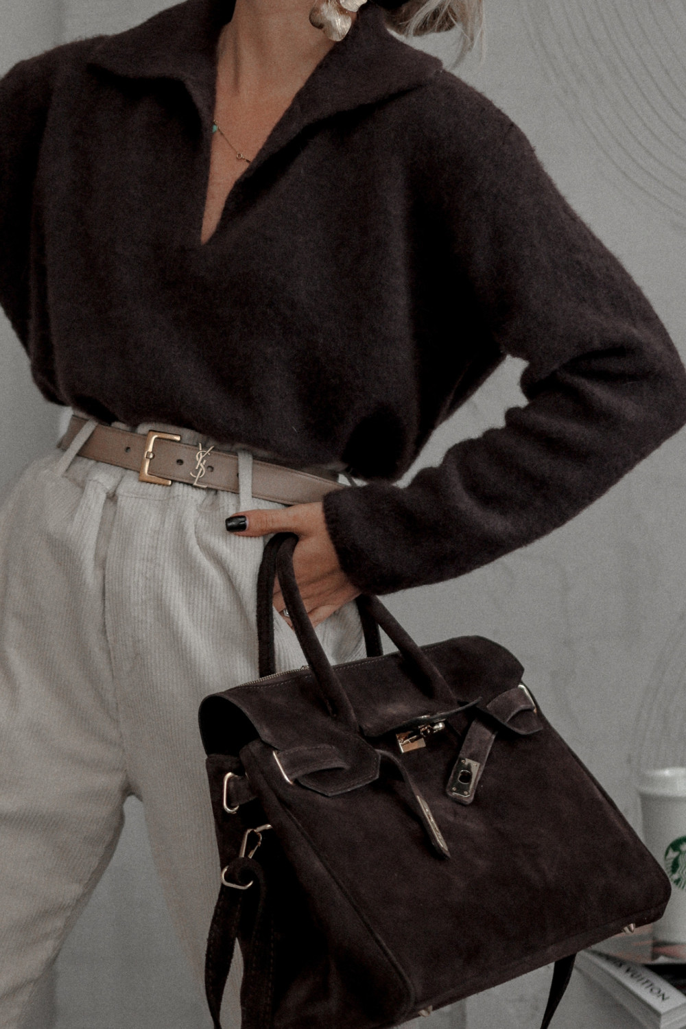 SWETER MIDNIGHT DRAPE Z KOŁNIERZEM TYPU POLO Z ALPAKI - CZEKOLADOWY