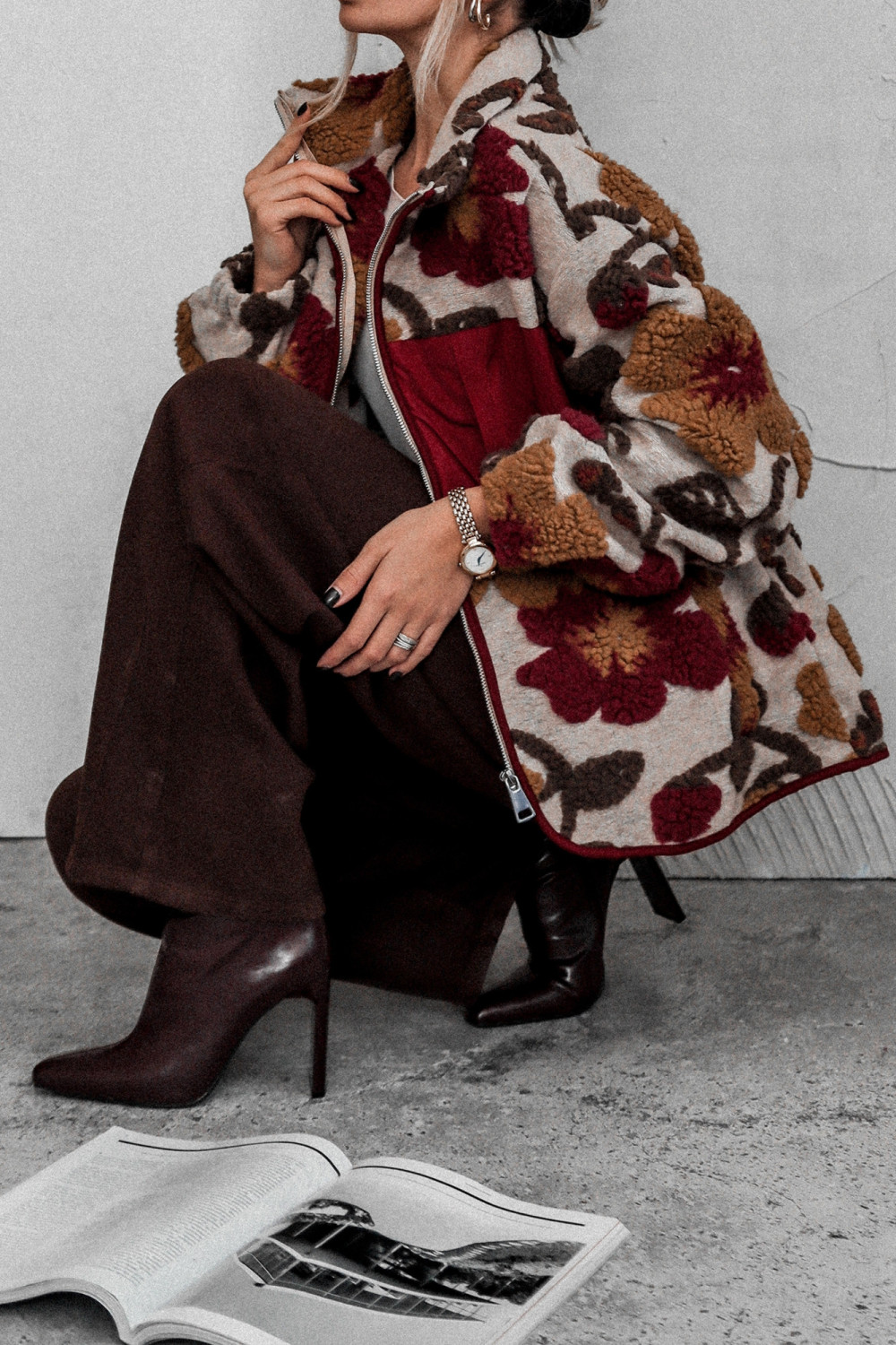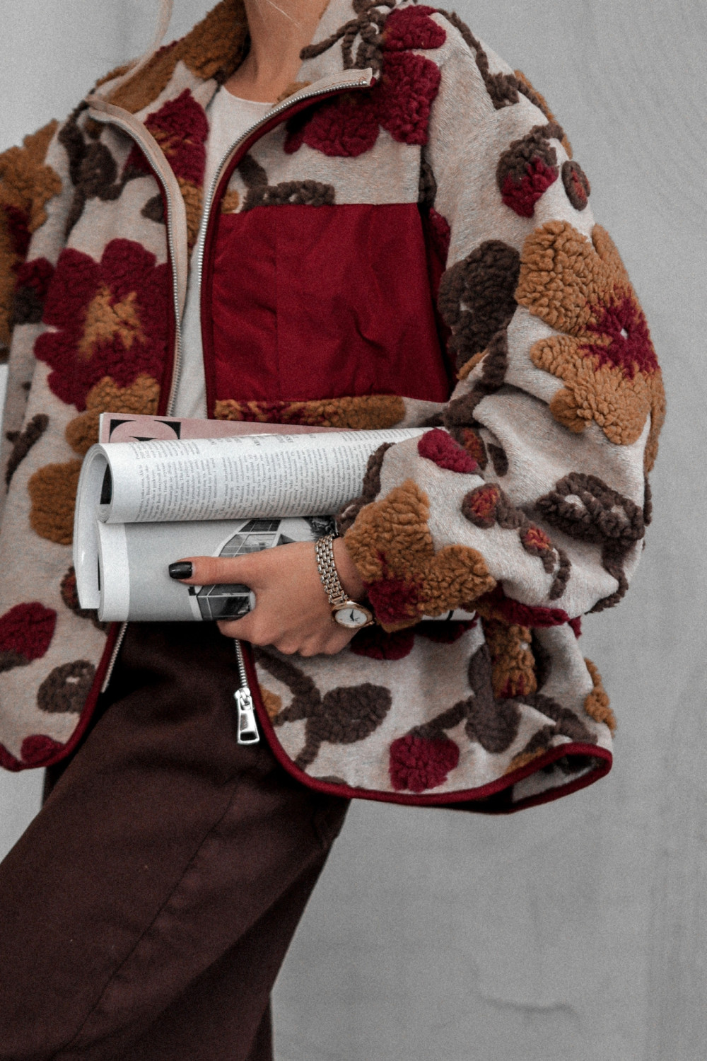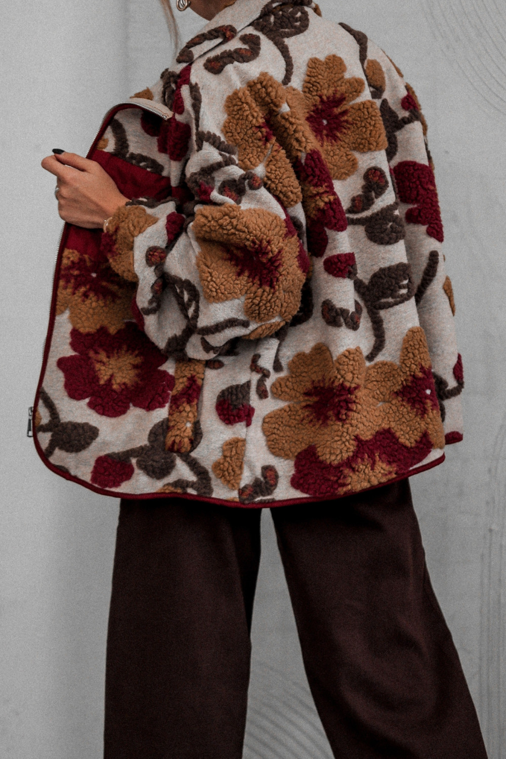 To, co wyróżnia tę kurtkę, to unikalny wzór w kwiaty wykonany z kontrastowego materiału – subtelny, a zarazem wyrazisty detal, który przyciąga spojrzenia. Oversize’owy krój nadaje stylizacji luźny, nonszalancki charakter, idealny dla kobiet ceniących modę w stylu city chic.