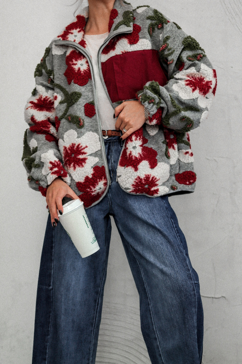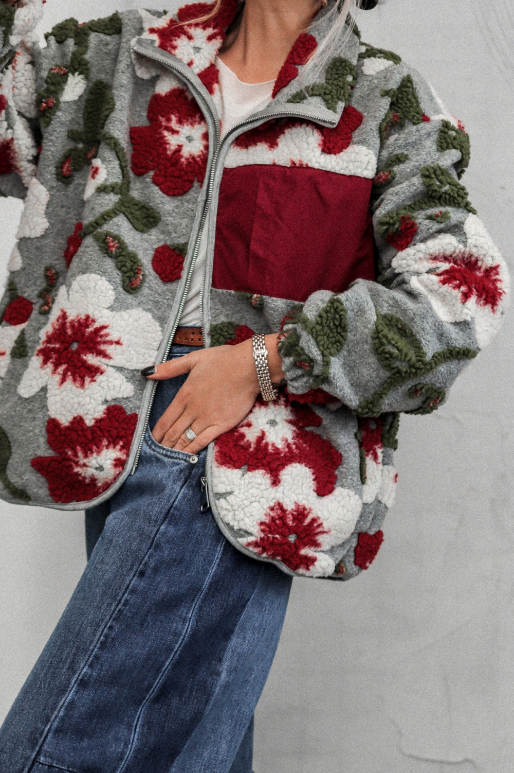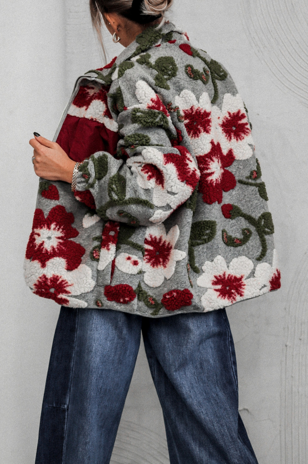 To, co wyróżnia tę kurtkę, to unikalny wzór w kwiaty wykonany z kontrastowego materiału – subtelny, a zarazem wyrazisty detal, który przyciąga spojrzenia. Oversize’owy krój nadaje stylizacji luźny, nonszalancki charakter, idealny dla kobiet ceniących modę w stylu city chic.
