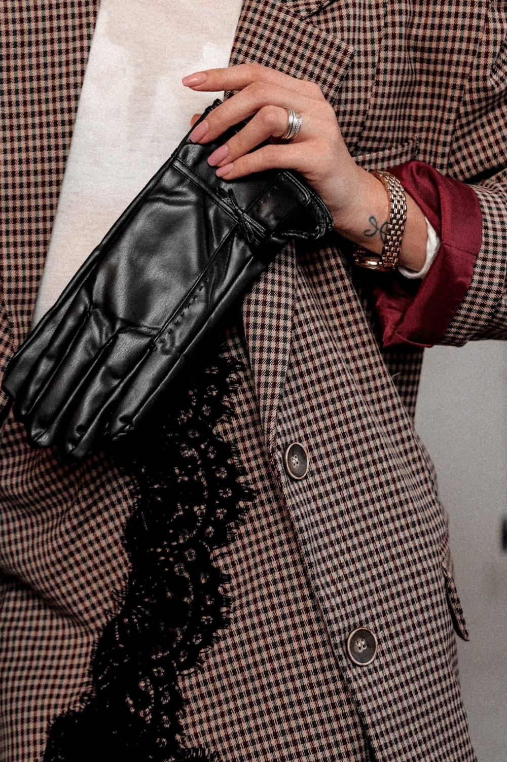 W zestawie znajdziesz czarne rękawiczki, które stanowią stylowy akcent i dodają całości niepowtarzalnego pazura.