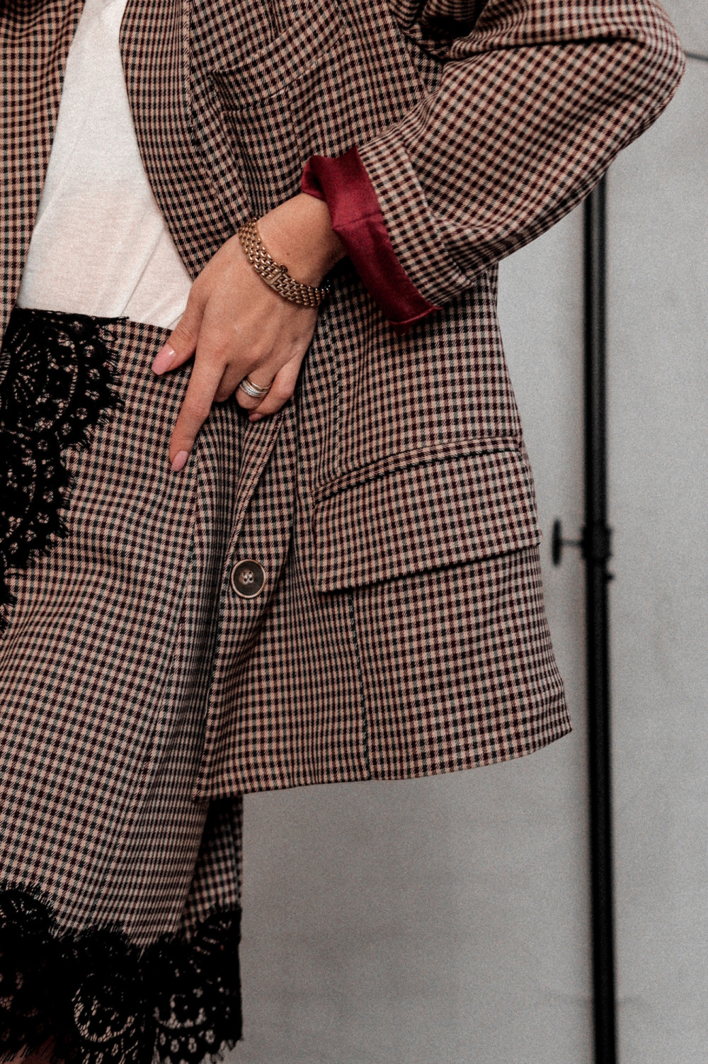 Zestaw marynarkę z spódnicą mini w tym samym odcieniu, dostępną w naszym sklepie online, i stwórz pełną stylizację w duchu współczesnej elegancji.
