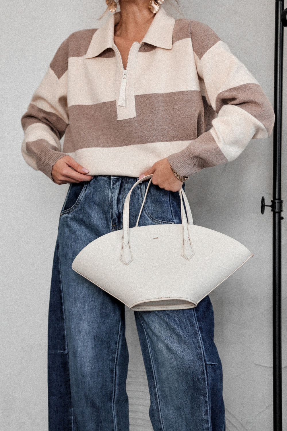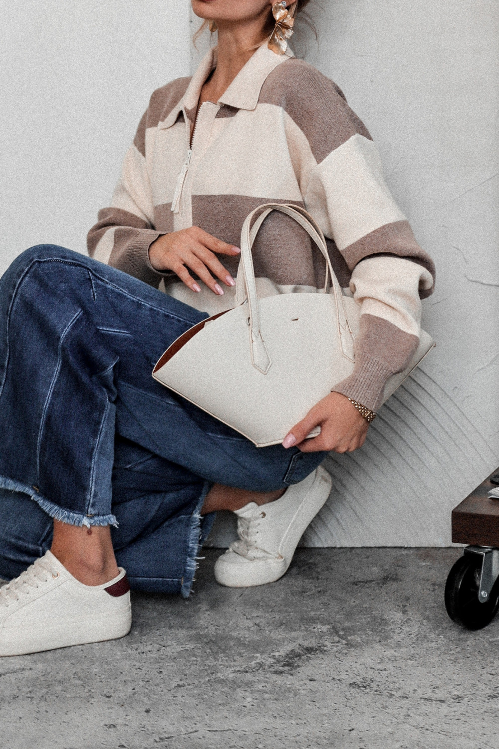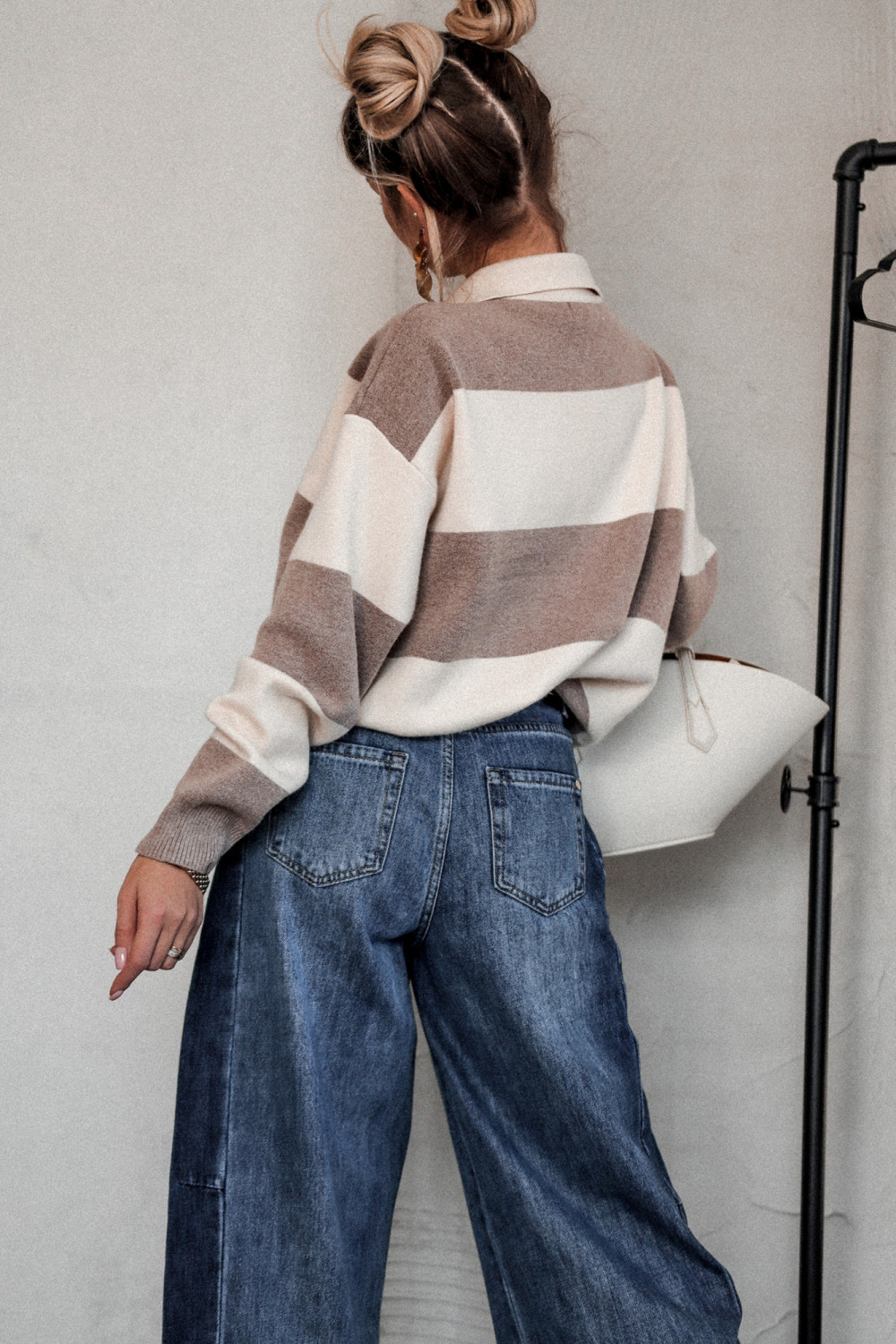 Wprowadź do swojej jesiennej garderoby nutę niewymuszonej elegancji. Nasz sweter o luźniejszym kroju w ponadczasowe paski ecru–beż to must-have dla kobiet, które kochają połączenie wygody, stylu i miejskiego charakteru. Miękki, otulający i niezwykle komfortowy – idealny na chłodniejsze dni.
