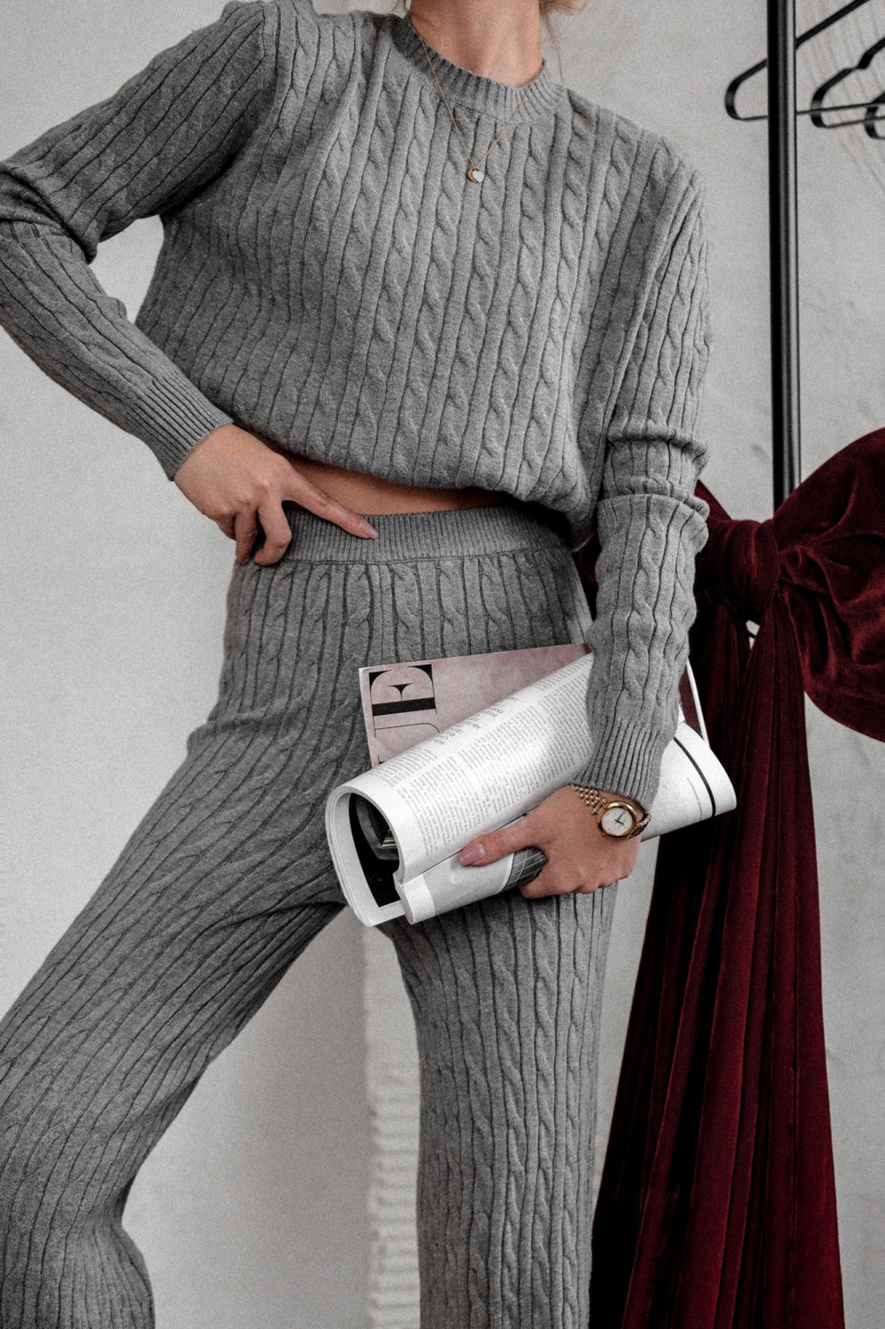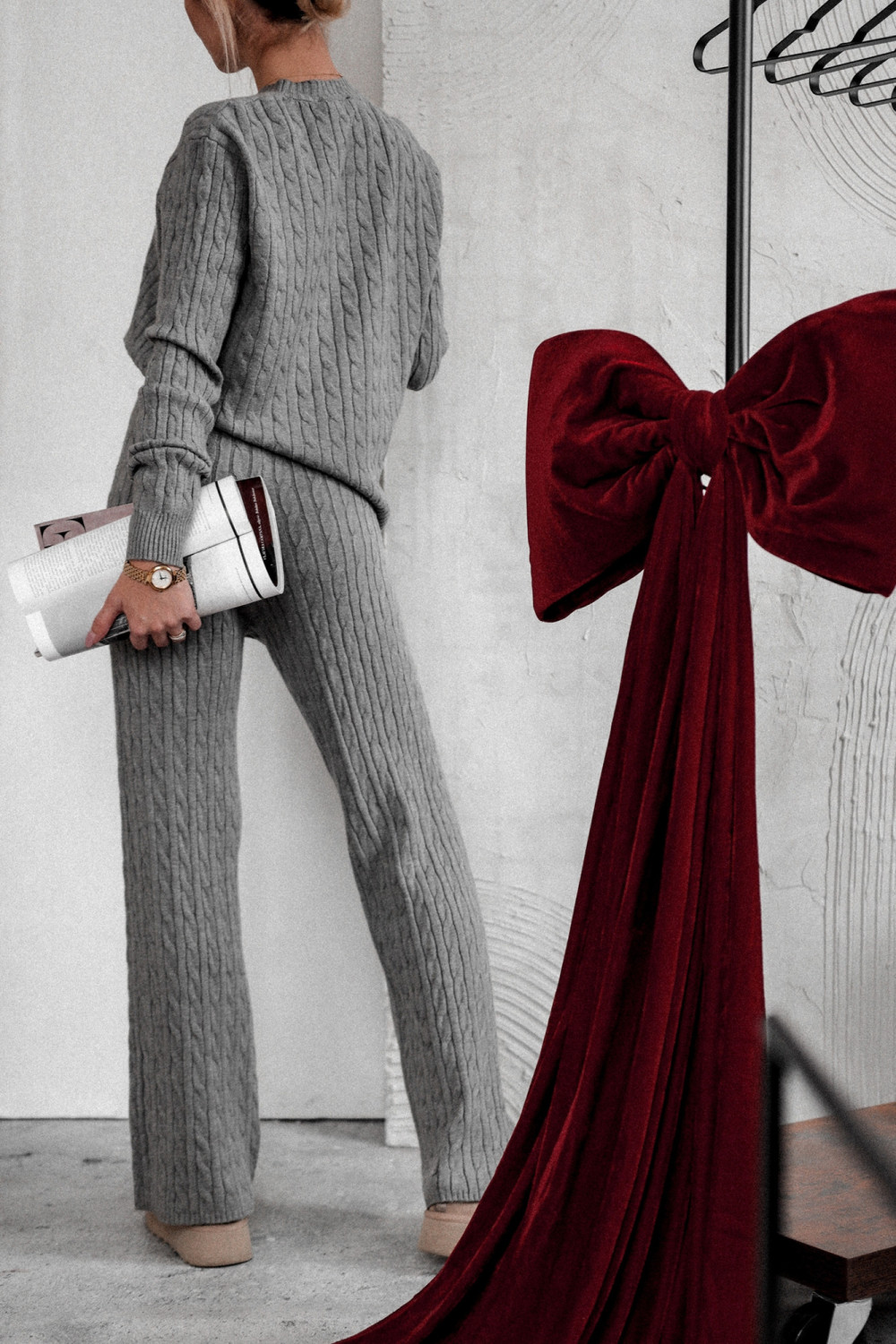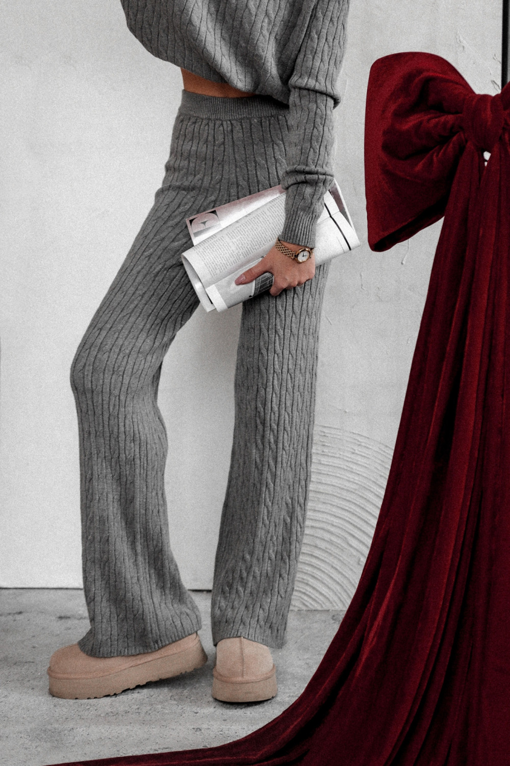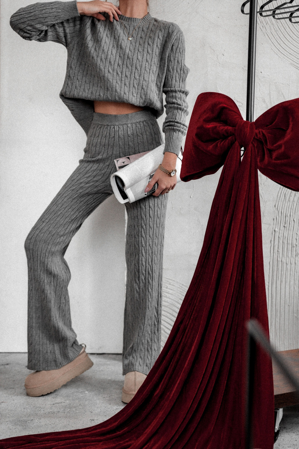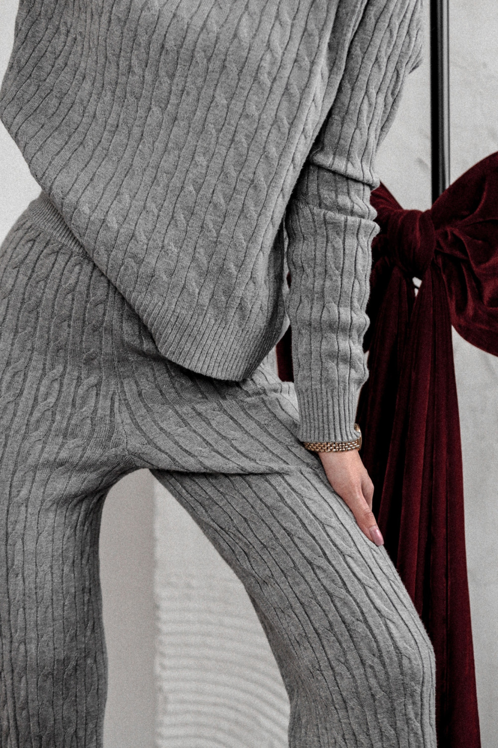 Odkryj komplet, który łączy w sobie wyjątkowy komfort i styl w estetyce cuty chic z subtelną elegancją. Wykonany w 95% z bawełny, zachwyca miękkością, przewiewnością i jakością, która sprawdzi się przez cały rok. Zarówno sweter, jak i spodnie zdobi warkoczowy splot, dodający całości przytulnego, a zarazem wysmakowanego charakteru.