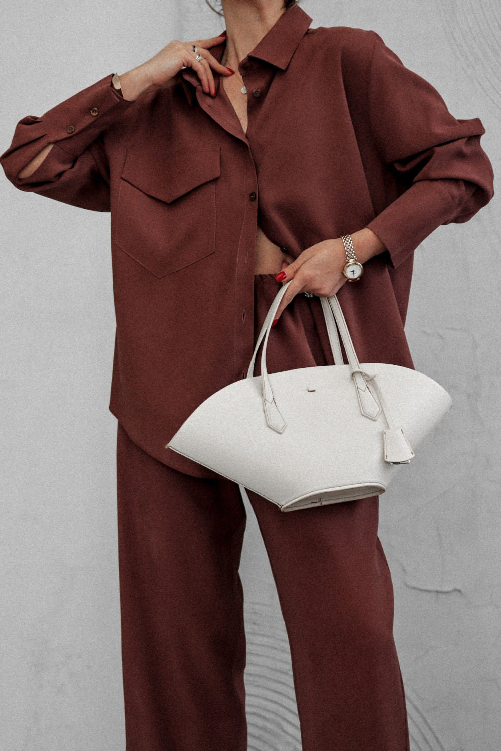 Stylowy komplet składający się z koszuli oraz spodni, zaprojektowany z myślą o kobietach, które cenią komfort, nowoczesną elegancję i uniwersalność stylizacji. Minimalistyczna forma i neutralna kolorystyka sprawiają, że zestaw doskonale sprawdzi się jako baza wielu looków – zarówno codziennych, jak i bardziej dopracowanych w duchu city chic.
